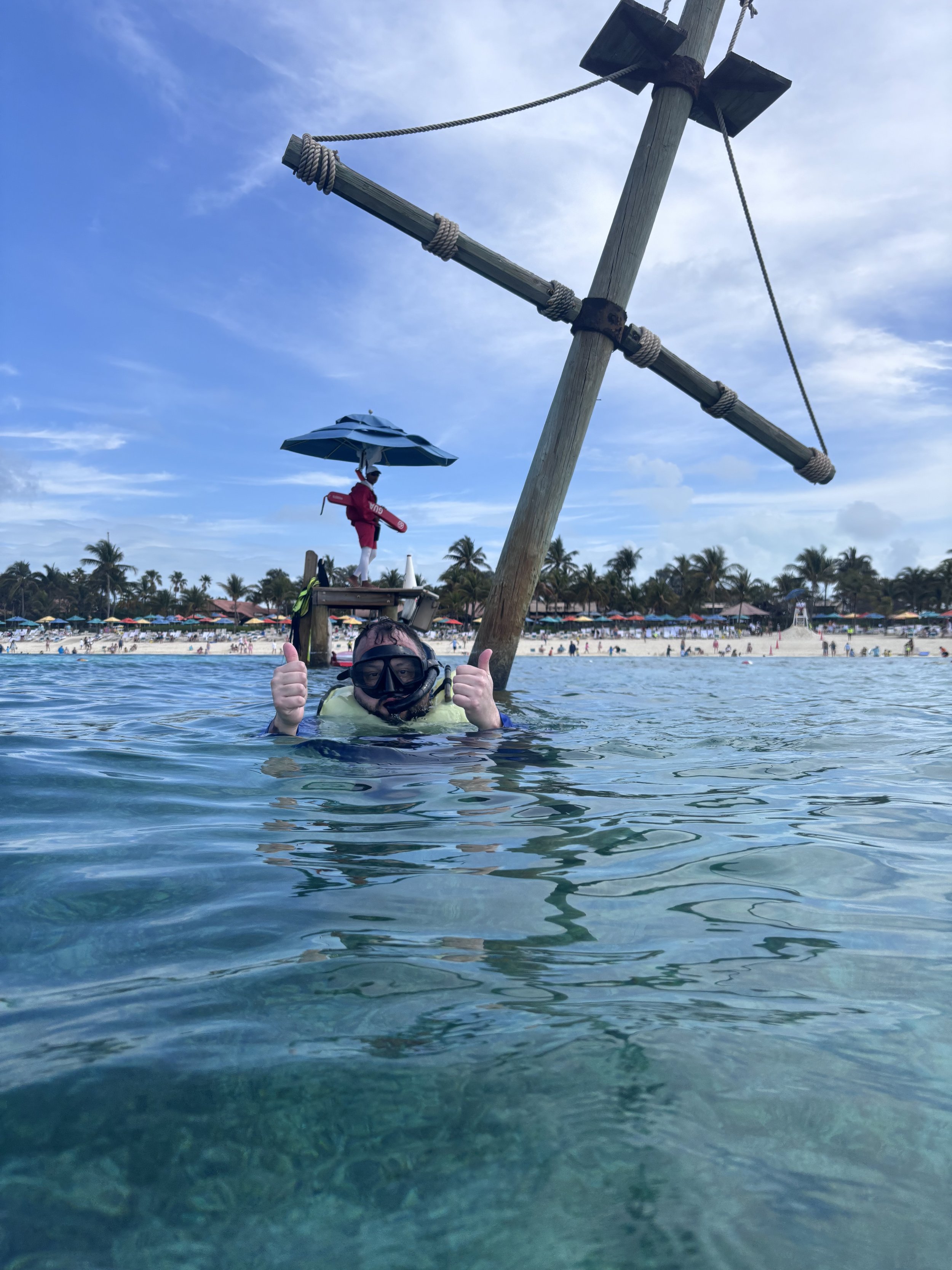 We got ourselves together and got off the ship around 10am. I loved stepping off onto the island. This is such an easy port stop with everything right there. We headed over to the beach to get our rented snorkel equipment. The people working at the stand were not at all friendly and we were told there would be brief instruction, but there was none. They just handed us the stuff and that was it. The equipment was fine, but not in the best shape and my mask kept fogging up and filling with water (possibly user error since I’ve never done this before). Lyra bailed on snorkeling pretty much immediately because she was uncomfortable and just hung out in the water/near the beach. Sebastian switched to a regular life jacket and then was good to go. Mitch loved the experience and swam all the way out to sunken pirate ship. I went about half way but it was really difficult for me - need to get into better swimming shape for next time. It was VERY cool to find the items they have sunk underwater and if you’re a solid swimmer this would be perfect - maybe bring your own snorkel gear.