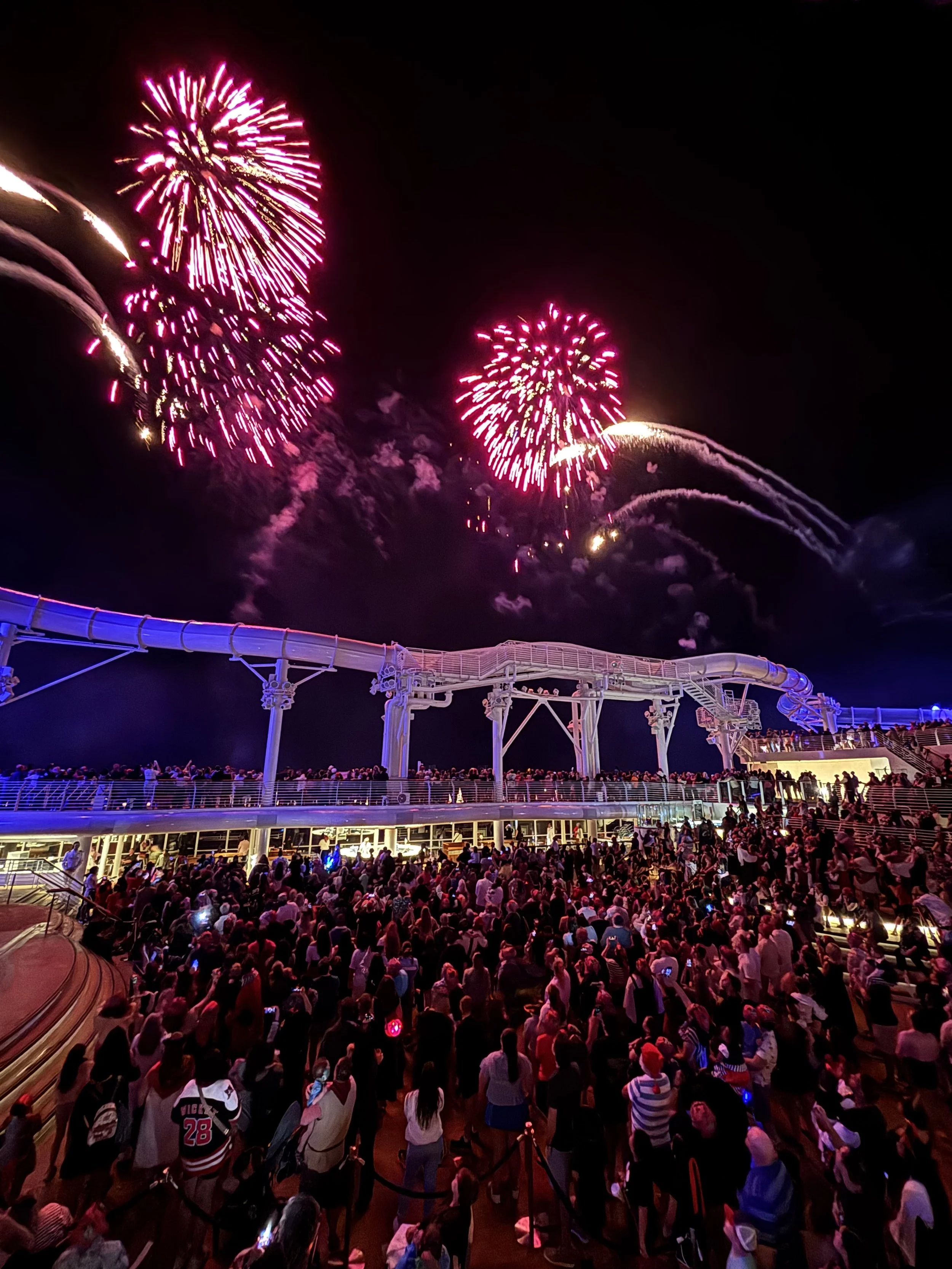 Lyra met up with us after that and we headed up to deck 12 to grab a spot for the Pirate Parlay Party and fireworks around 9:45pm. We had the perfect spot to see everything and Sebastian went and got snacks and drinks for everyone while we waited for it to start.
