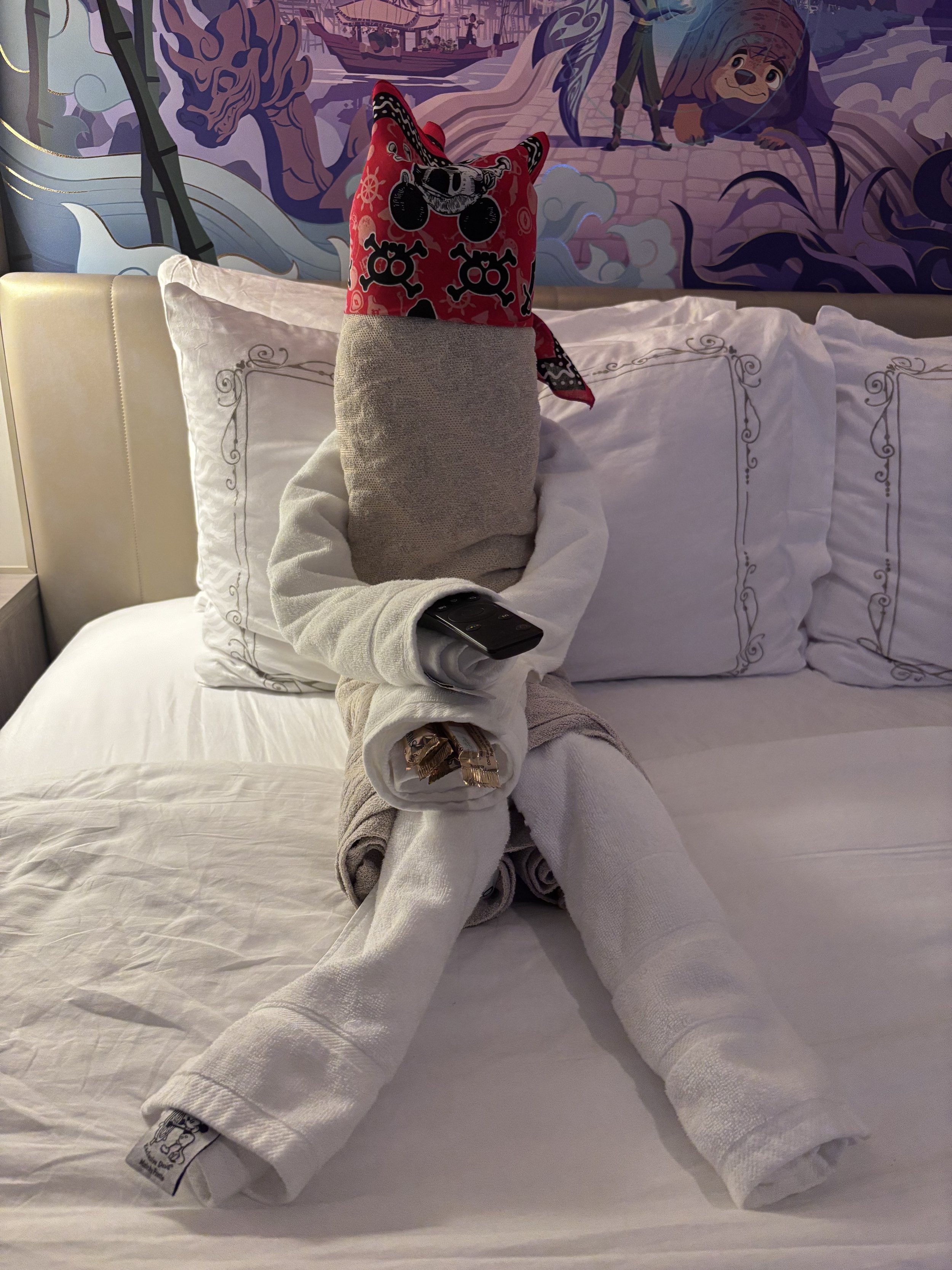Post dinner Mitch and the kids went to put out our suitcases. If you don’t want to carry them off the ship yourselves they ask that you put them out tagged (they will give you tags) before 10pm. They also got a glimpse of our towel animal for the night - which was a doozy. Then they went to get milkshakes at the sweets shop (additional cost) while I did a little shopping for myself and got in line VERY early for Hercules! We were told that this show was so popular that even with a 1pm and 6:30pm show that ours at 8:30 would fill up. I didn’t want to chance it. I was the third person in line at 7:40pm. They let us in a little before 8:15pm.